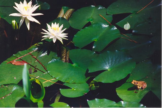 Water Lillies (Nymphaea odorata) with Bronze Frog